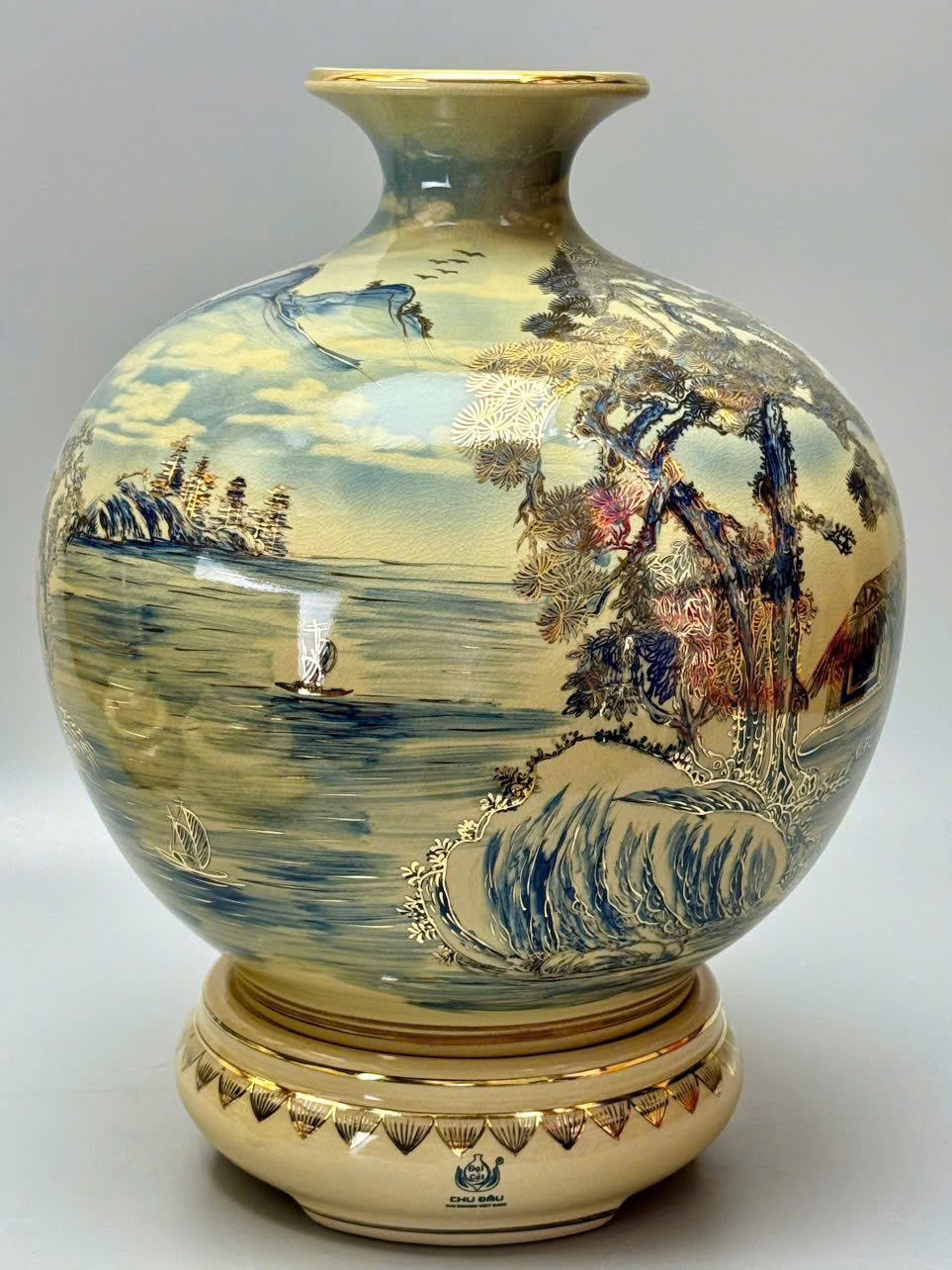 Bình hút lộc H35/H45 là tuyệt phẩm gốm Chu Đậu, kết tinh từ bàn tay tài hoa của nghệ nhân làng gốm truyền thống. Trên nền men xanh coban vân mây đặc trưng, cảnh sơn thủy hữu tình hiện lên sống động: núi non trùng điệp, sông nước uốn lượn, mái nhà tranh ẩn hiện giữa rừng cây, tất cả được vẽ tay thủ công và điểm xuyết bằng vàng thật 24K, tạo nên vẻ đẹp vừa cổ điển vừa sang trọng.