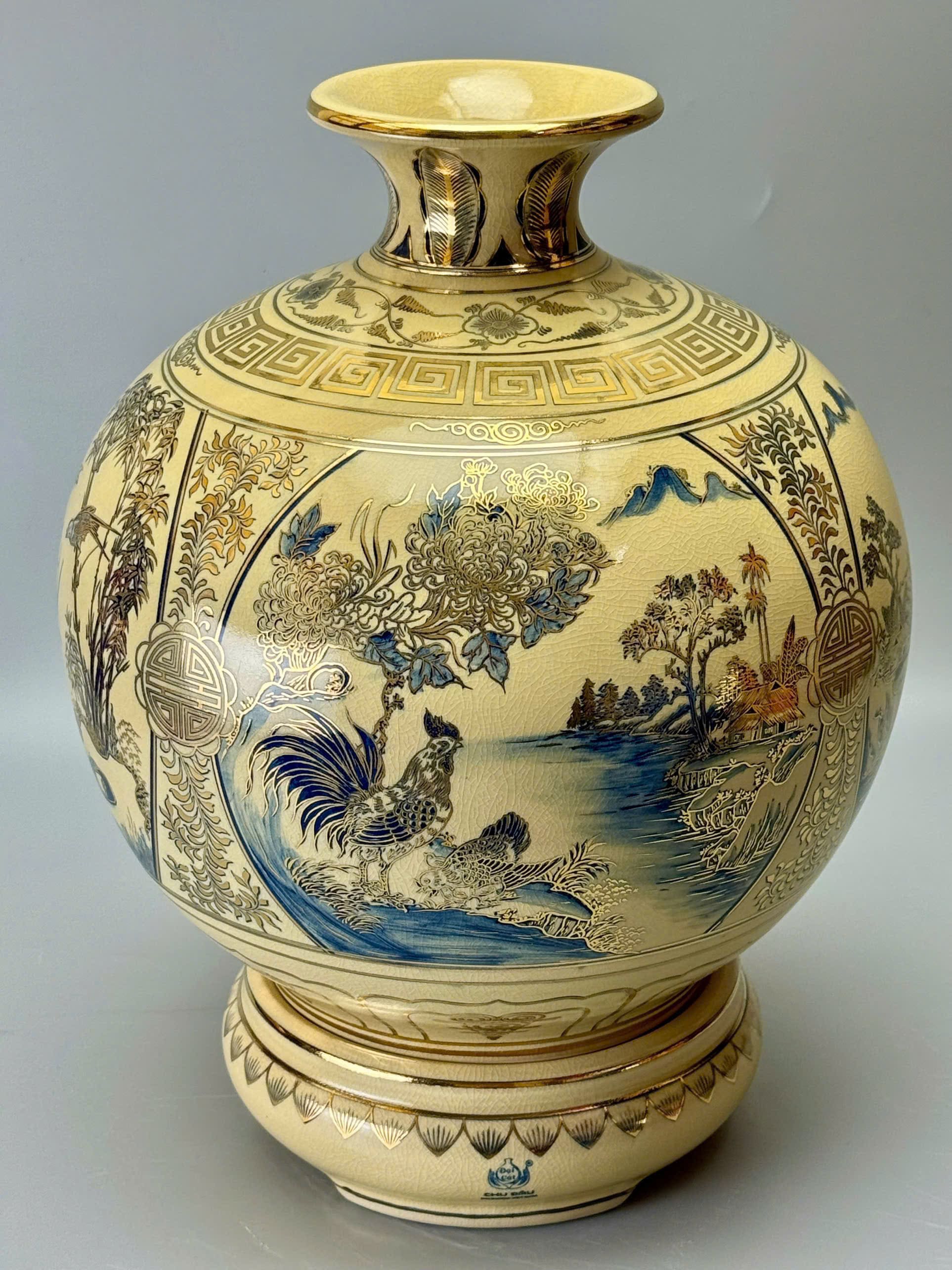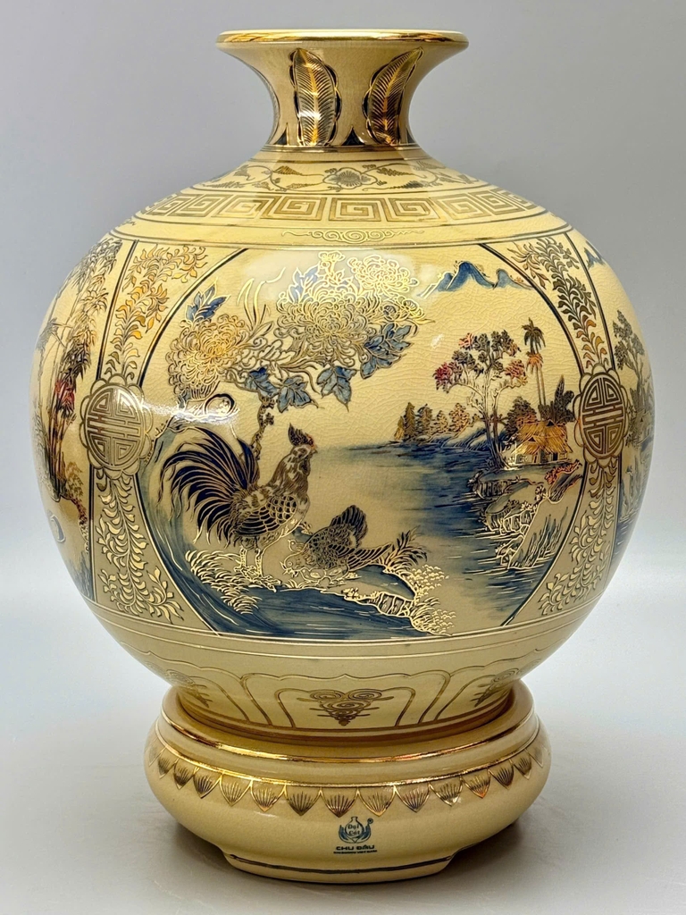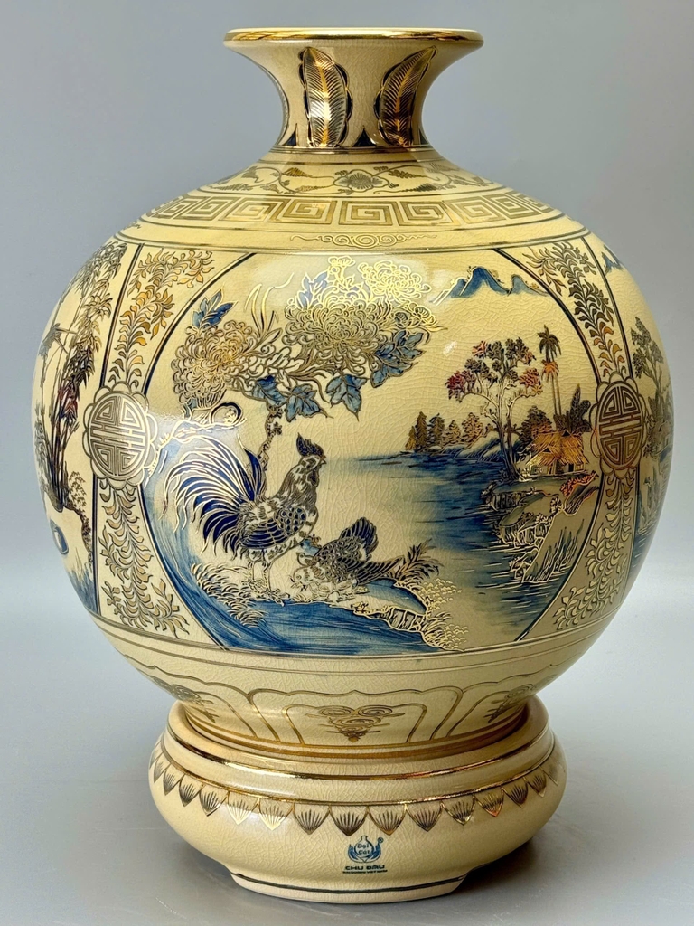Từ khóa chính: bình hút tài lộc sơn thủy hữu tình, gốm Chu Đậu, vẽ vàng 24K, men rạn cao cấp, bình phong thủy, đồ gốm trang trí