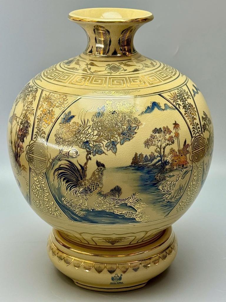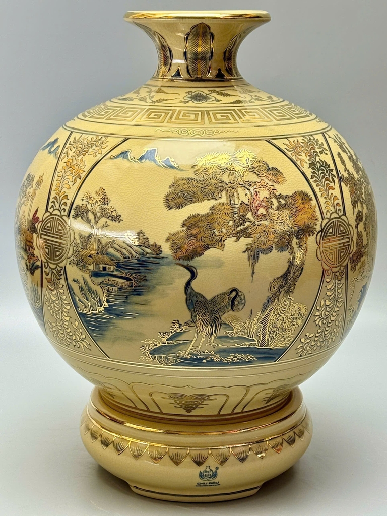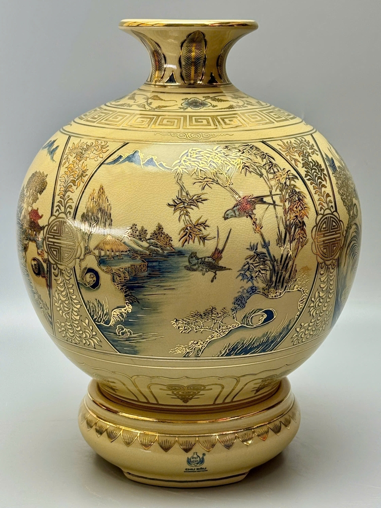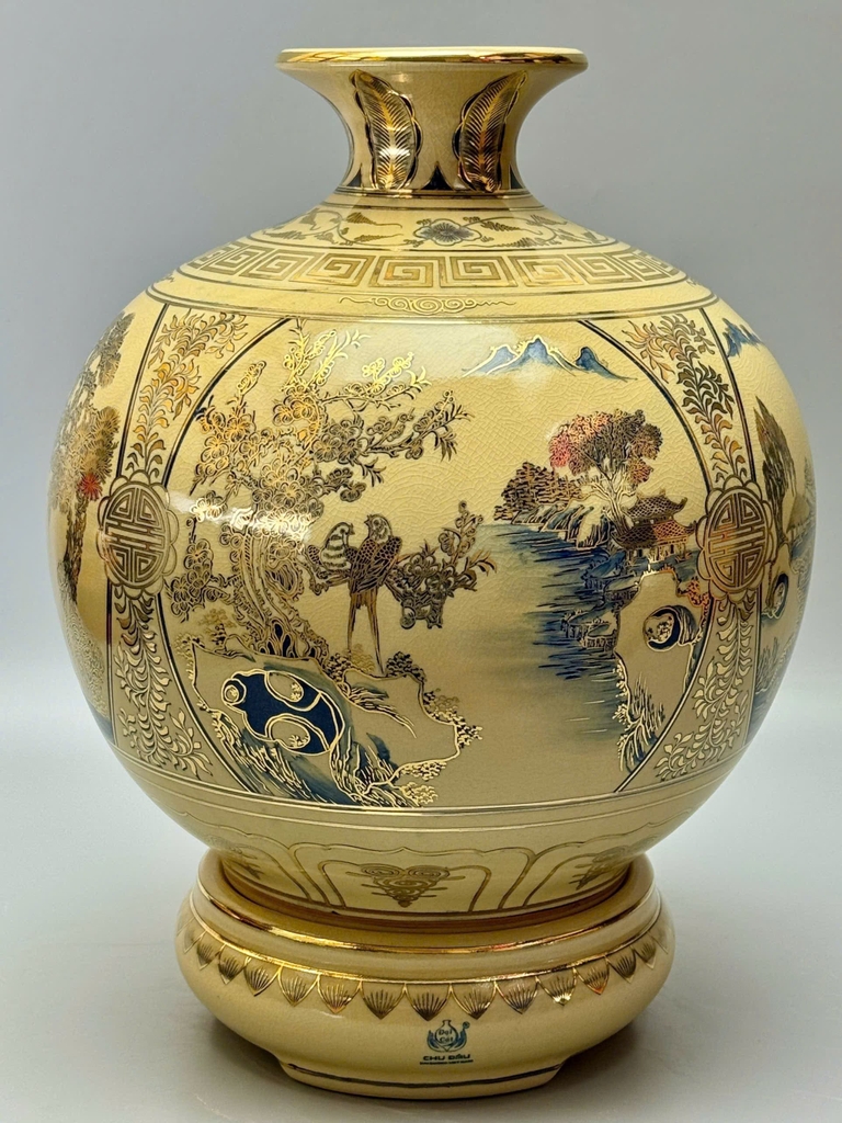 🏺 Bình Hút Tài Lộc Sơn Thủy Hữu Tình – Gốm Chu Đậu Vẽ Vàng 24K