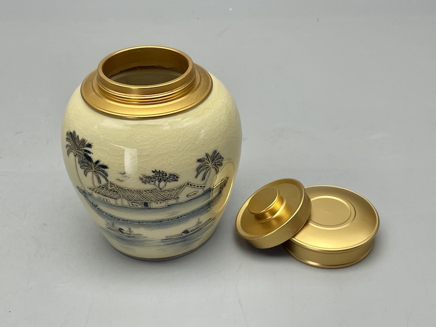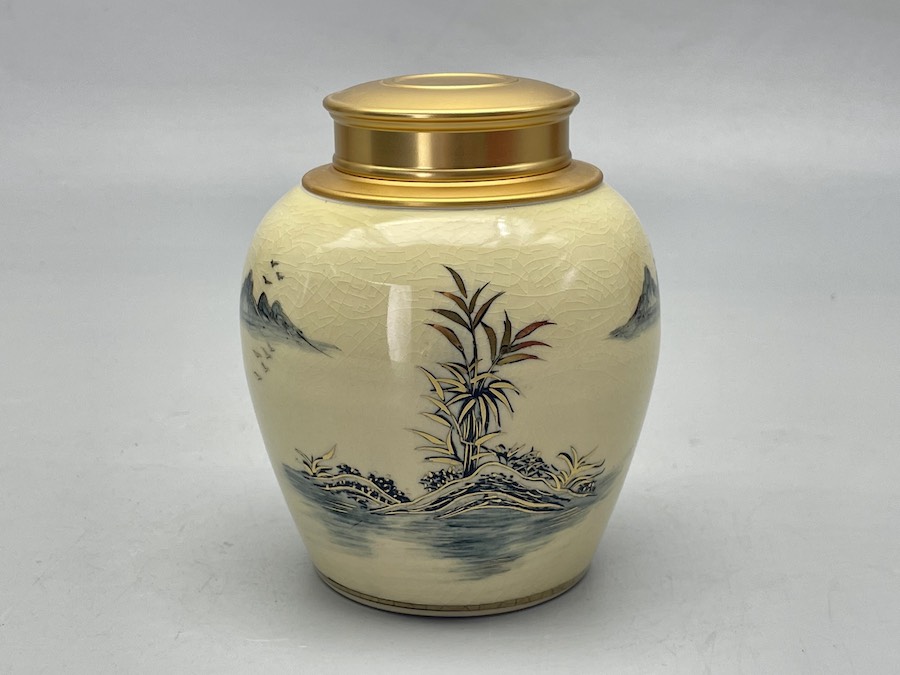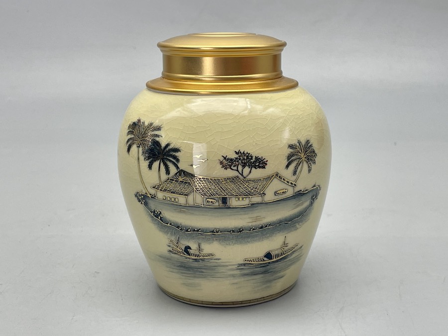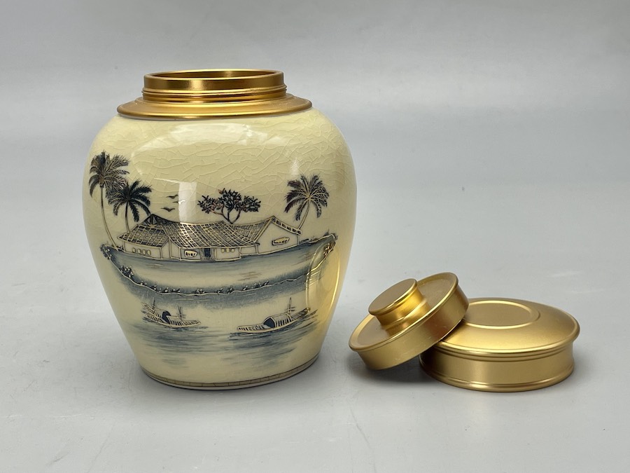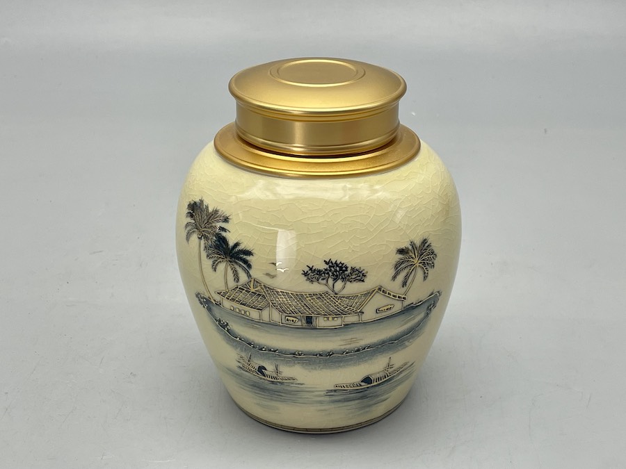Hộp Đựng Trà Cảnh Đồng Quê Gốm Chu Đậu Vẽ Vàng Kim