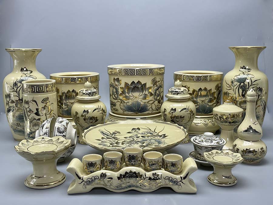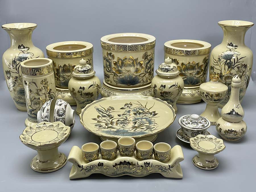 SET 1 Đồ Thờ Họa Tiết Hoa Sen Gốm Chu Đậu Vẽ Vàng Kim