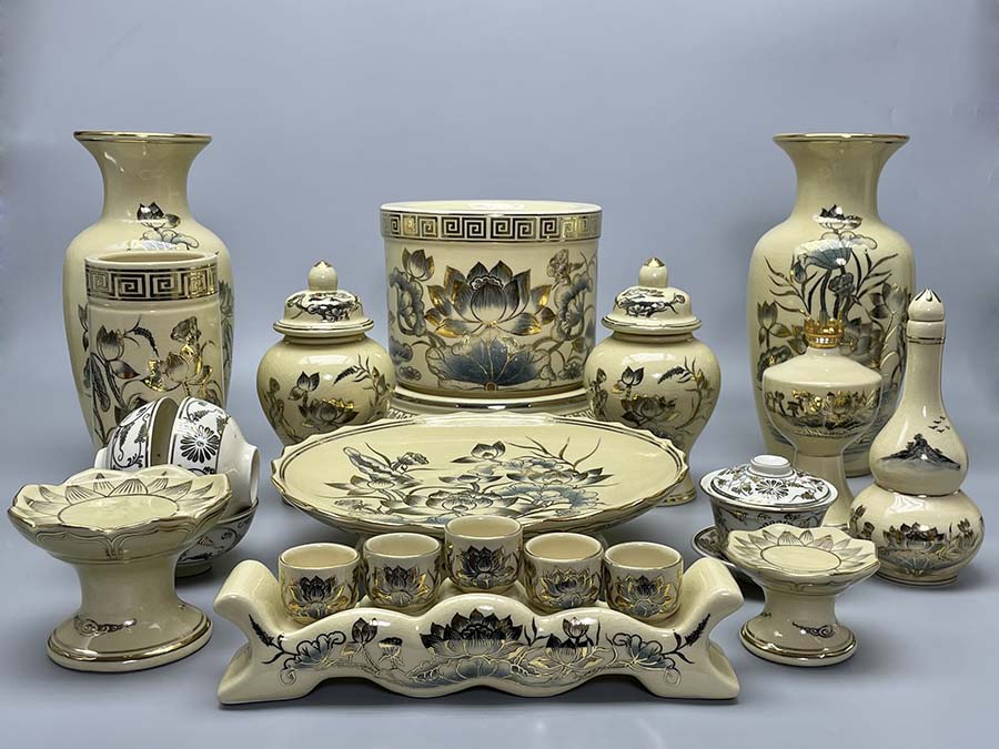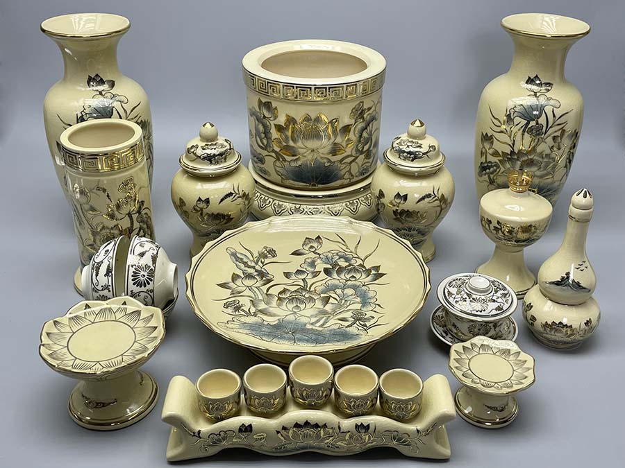 Set 2 Đồ Thờ Họa Tiết Hoa Sen Gốm Chu Đậu Vẽ Vàng Kim